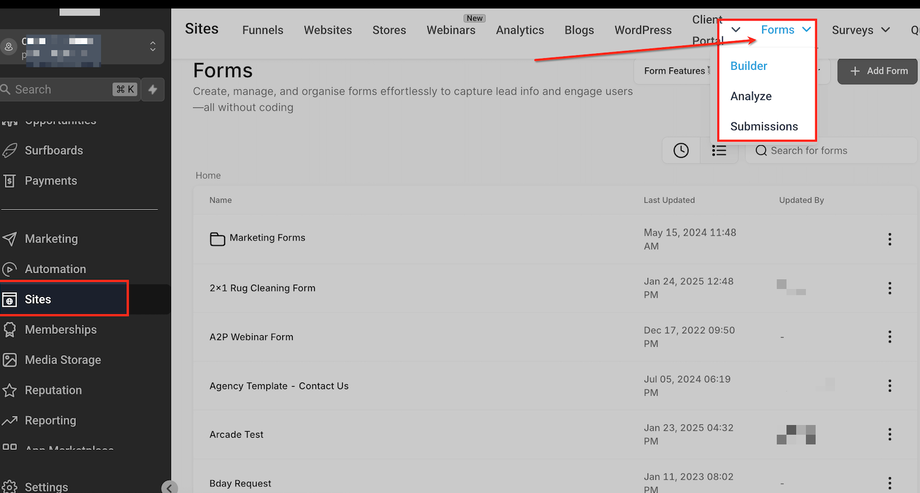 Gehen Sie im Dashboard zum Bereich „Sites“ im Hauptmenü. Klicken Sie oben rechts auf „Forms“, um den Formular-Builder zu öffnen.