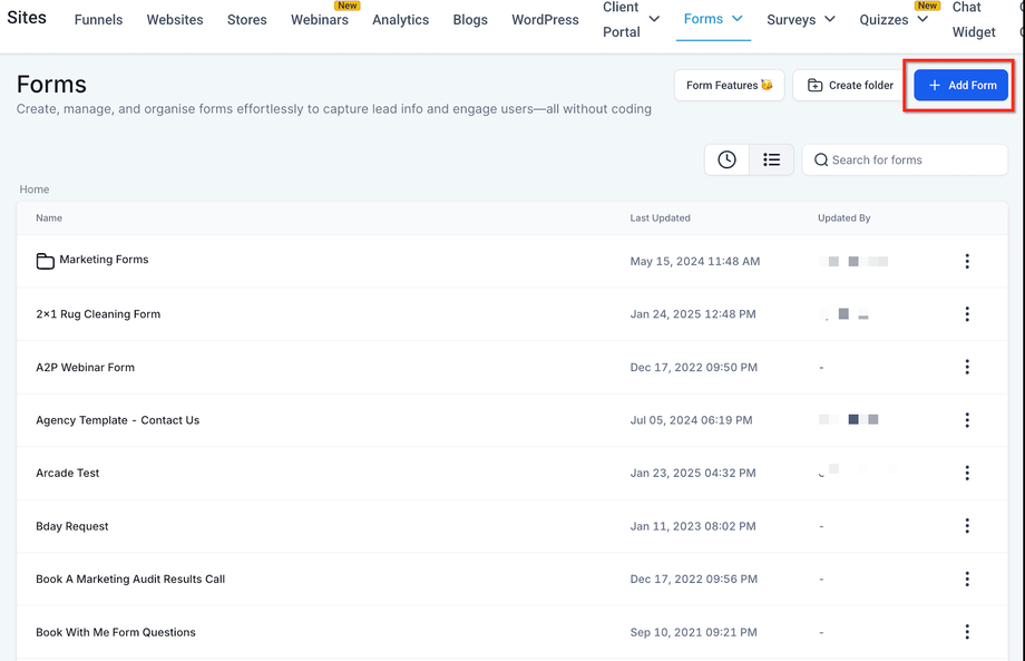 Oder klicken Sie auf „+ Add Form“, um ein neues Formular zu erstellen