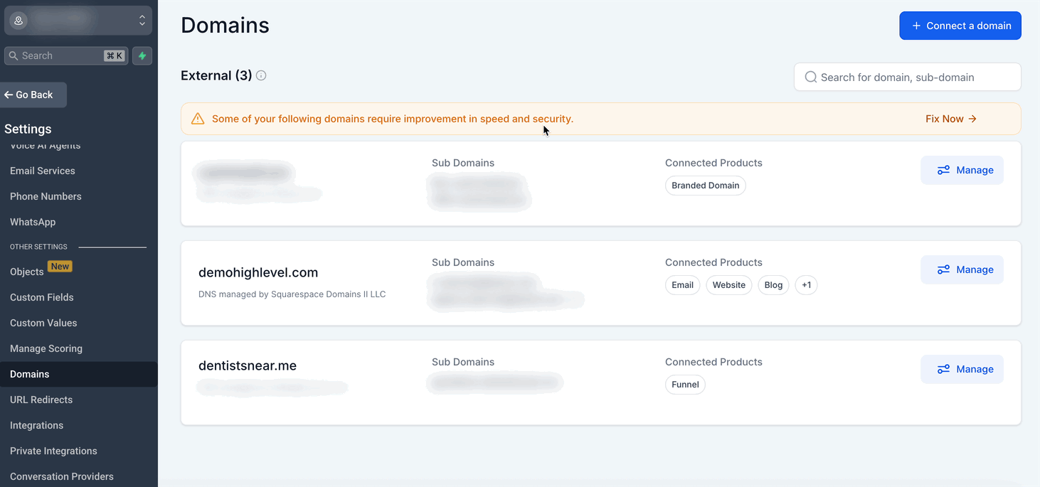 Klicken Sie auf Verwalten neben der gewünschten Domain