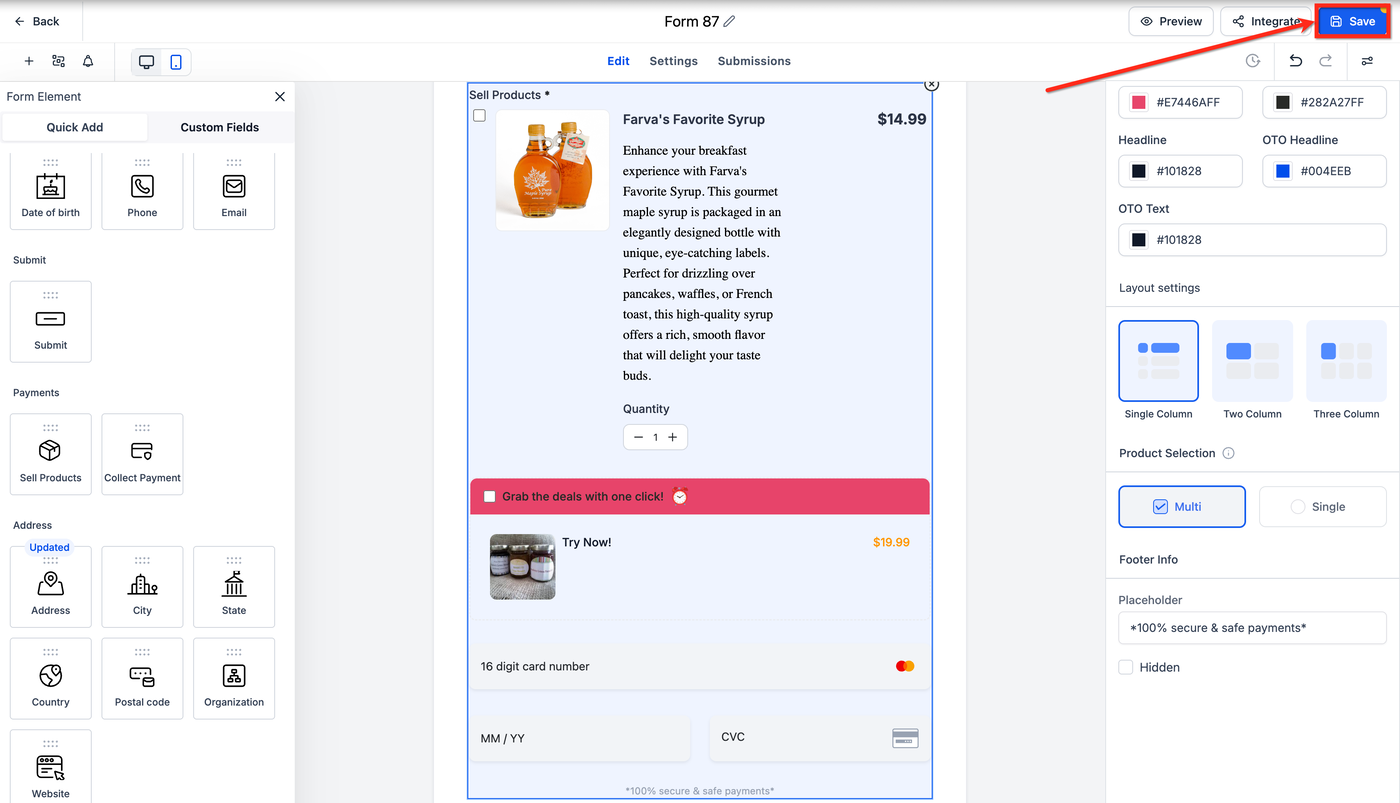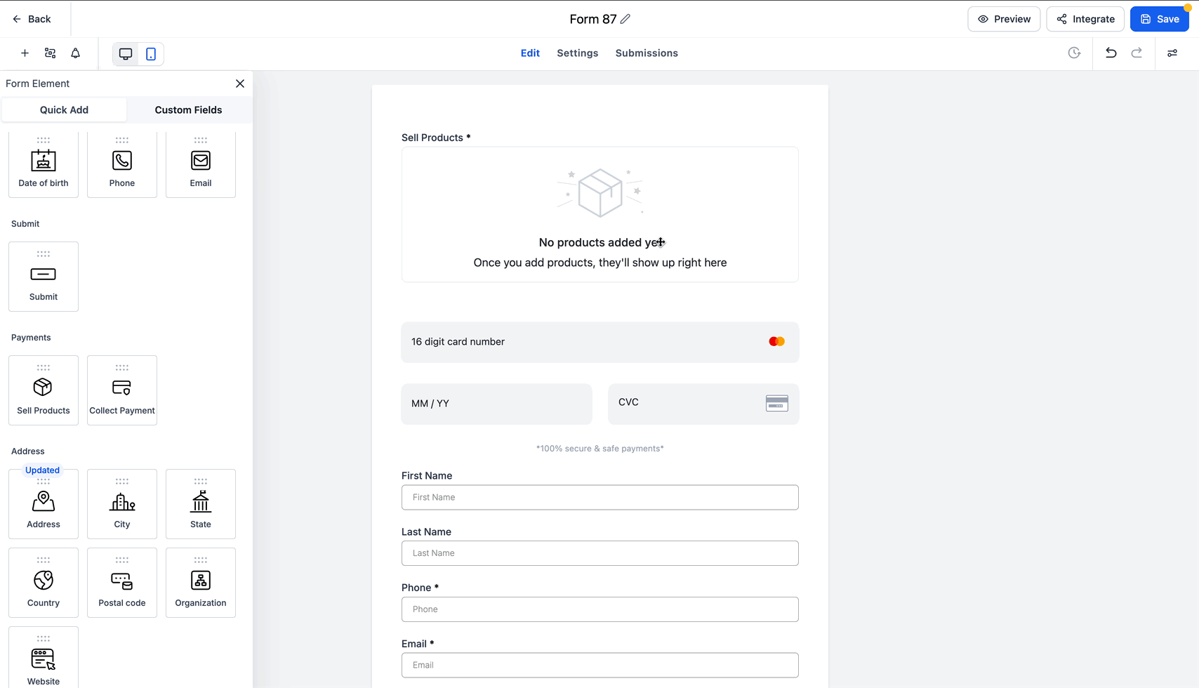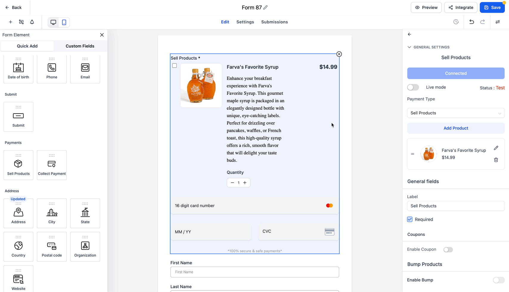 Ziehen Sie das Element Sell Products in das Formular