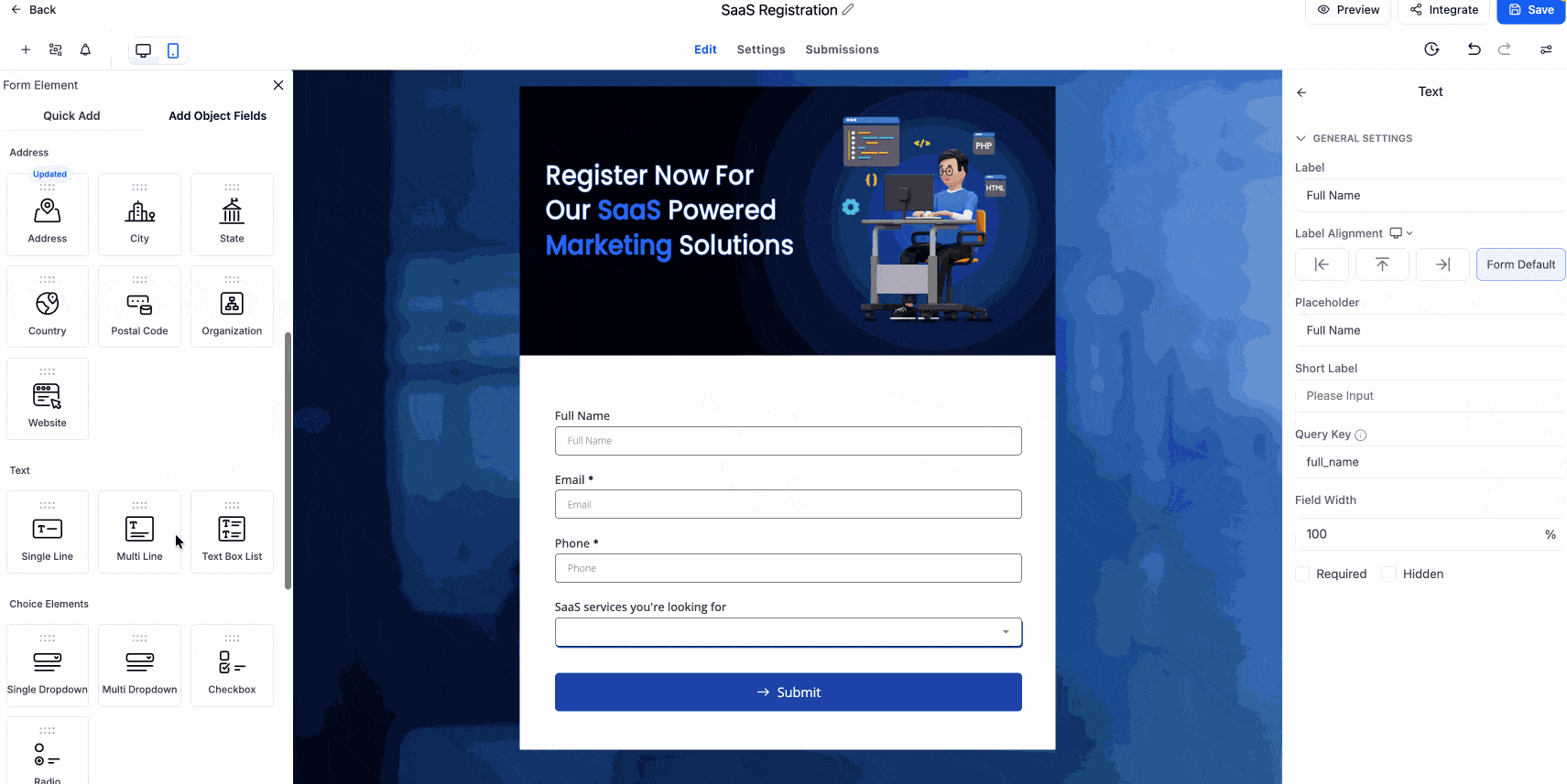 Sie können Labels, Platzhalter, Button-Texte, Dropdown-Optionen sowie Checkbox- und Radio-Auswahlen bearbeiten.