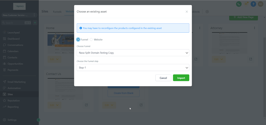 Du kannst nur bestehende Funnel-Schritte oder Website-Seiten innerhalb von HighLevel importieren.