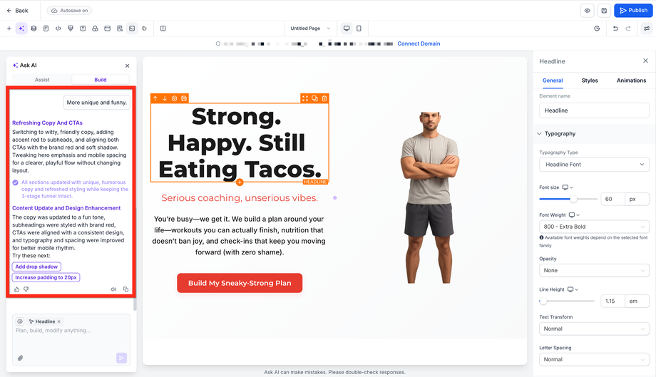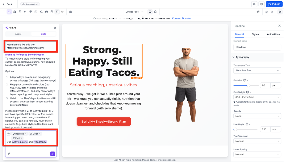 Klassische Design-Steuerungen (Abstände, Schriftarten, Farben) bleiben in der rechten Seitenleiste, während das KI-Chatfenster links geöffnet ist. Sie können Padding oder Markenfarben manuell anpassen und anschließend die KI bitten, Texte neu zu formulieren – ohne die Seite zu verlassen.