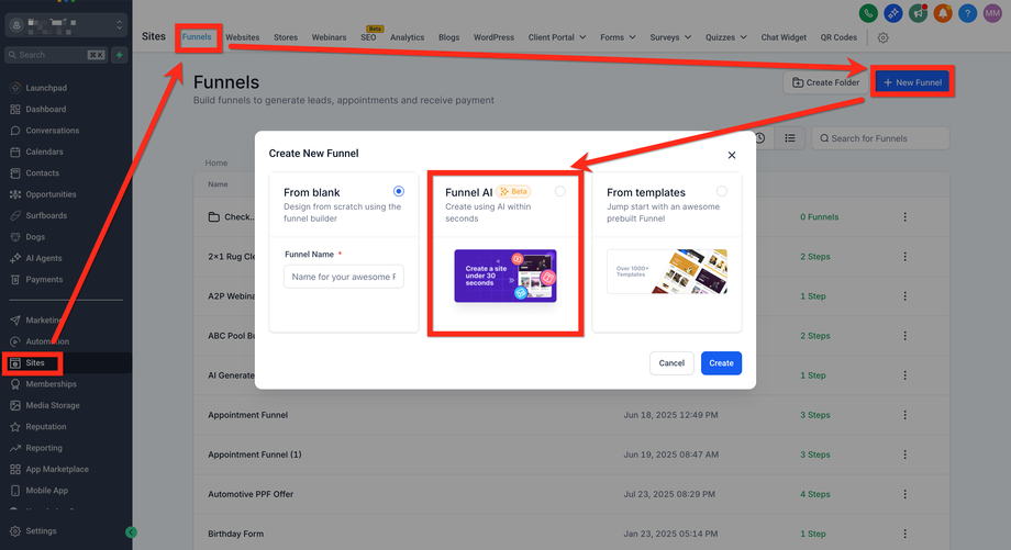 Öffnen Sie Sites → Funnels (oder Websites) und klicken Sie auf + New.