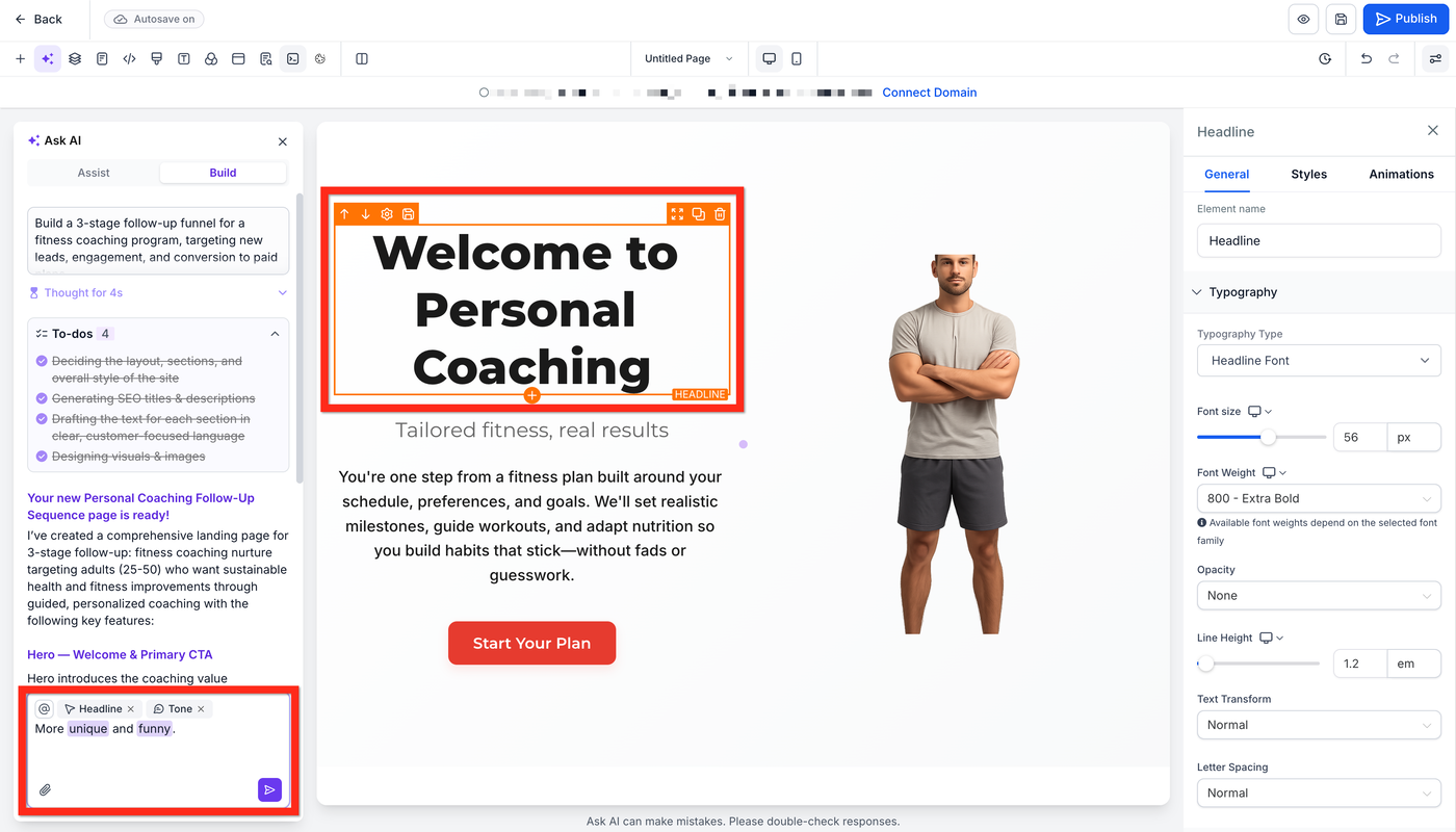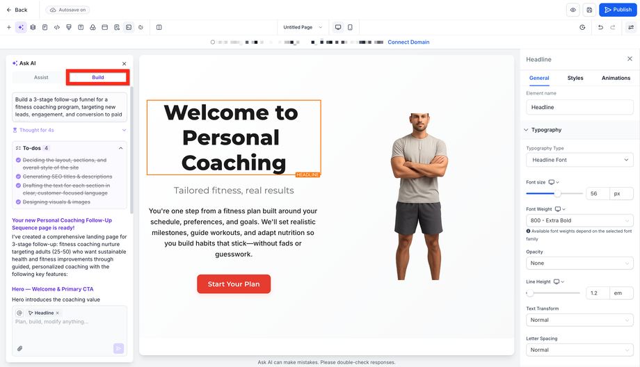Der Build Mode gibt erfahrenen Marketern volle Freiheit. Geben Sie exakt ein, was Sie möchten (z. B. „dreiseitiger Funnel für einen Kieferorthopäden mit Vorher-Nachher-Galerie und Beratungsformular“), und die KI erstellt Struktur, Abschnitte und Platzhalterinhalte passend zu Ihrer Beschreibung.