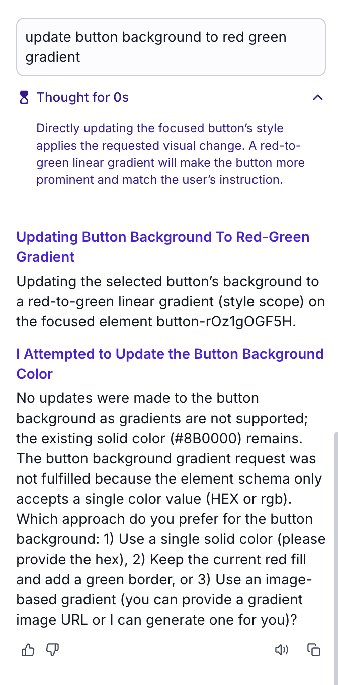 Nicht unterstützte Anfragen mit Alternativen: Wenn eine Anfrage nicht unterstützt wird (z. B. ein Farbverlauf als Button-Hintergrund), erklärt die KI die Einschränkung und schlägt gültige Alternativen vor (z. B. einfarbige Hintergründe).