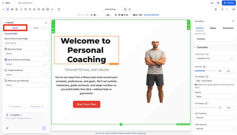 Der Assist Mode bietet einen Schritt-für-Schritt-Assistenten. Wählen Sie Branche, Funnel-Ziel, Zielgruppe, Sprache, Tonalität und bevorzugtes Layout aus, und die KI erstellt einen vollständigen, bearbeitbaren Entwurf – inklusive Texten, Bildern und Farbthemen – sodass Sie innerhalb weniger Minuten veröffentlichen können.