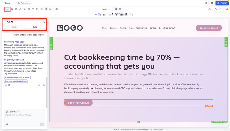 Behalten Sie Builder-Steuerungen und KI-Tools nebeneinander für einen nahtlosen Workflow.