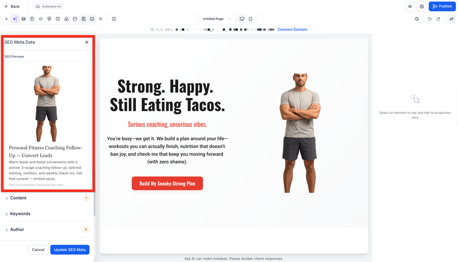 Der Builder füllt Meta-Titel, Beschreibungen und Alt-Texte für Bilder automatisch mit keyword-optimierten Vorschlägen aus und gibt jeder Seite eine solide SEO-Grundlage, noch bevor Sie auf Publish klicken.