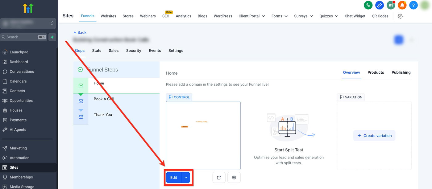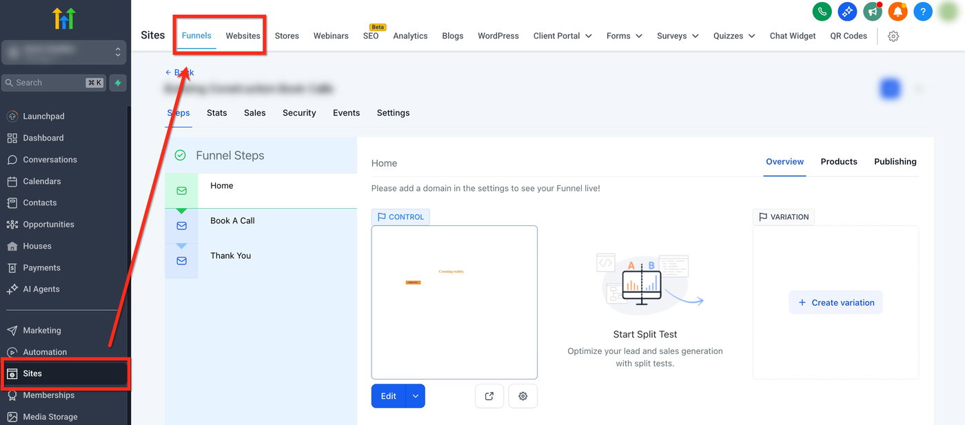 Navigiere zu Sites → Funnels oder Sites → Websites