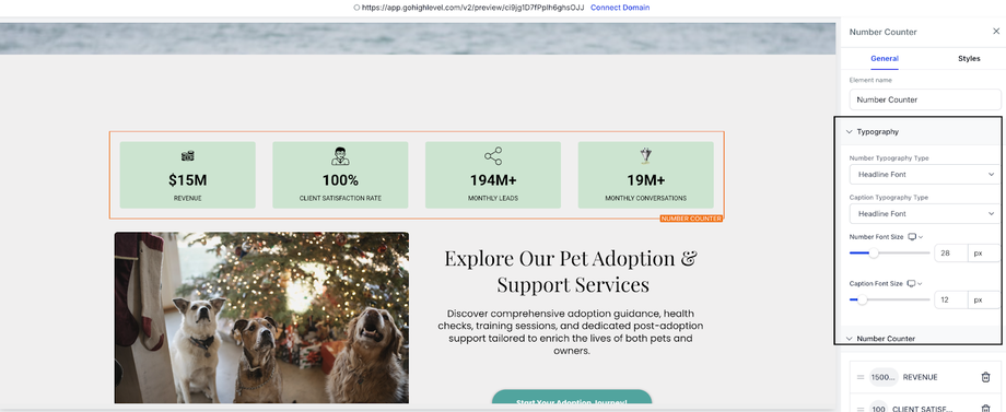 Das Number Counter Widget ist ein natives Element im Funnels- & Websites-Builder, das numerische Werte in lebendige Hochzähl-Animationen verwandelt. Durch die Kombination von intelligenter Formatierung, anpassbaren Layout-Steuerungen und Scroll-Triggern kannst du wichtige Erfolge auf eine Weise präsentieren, die sowohl visuell ansprechend als auch markenkonform ist.