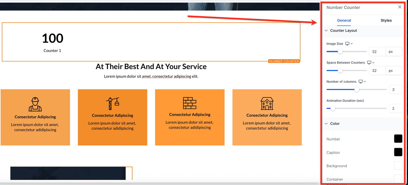 Wähle + Add Element in der Sidebar und finde das Number Counter-Element