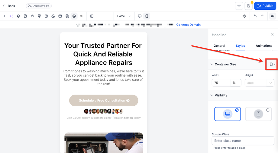 Verwenden Sie den Geräte-Umschalter neben Container Size, um zur Mobile-Ansicht zu wechseln, und geben Sie bei Bedarf einen mobil-spezifischen Wert ein.