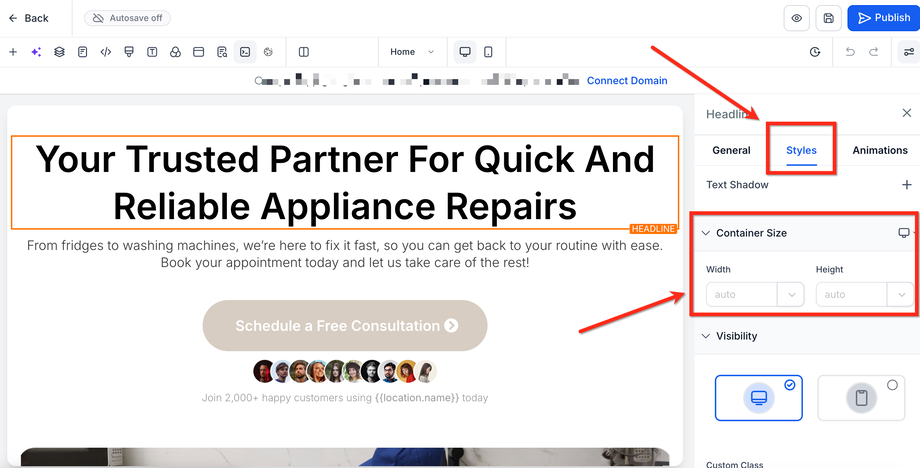 Wählen Sie in der rechten Seitenleiste den Tab Styles. Scrollen Sie anschließend zum Bereich Container Size.