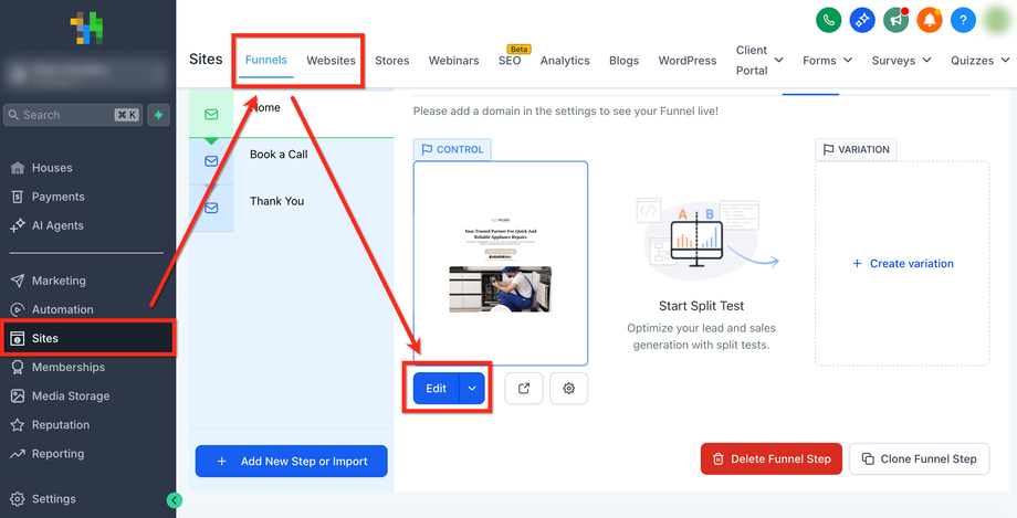Öffnen Sie den Page Builder für Ihre Funnel- oder Website-Seite über Sites > Funnels oder Websites.