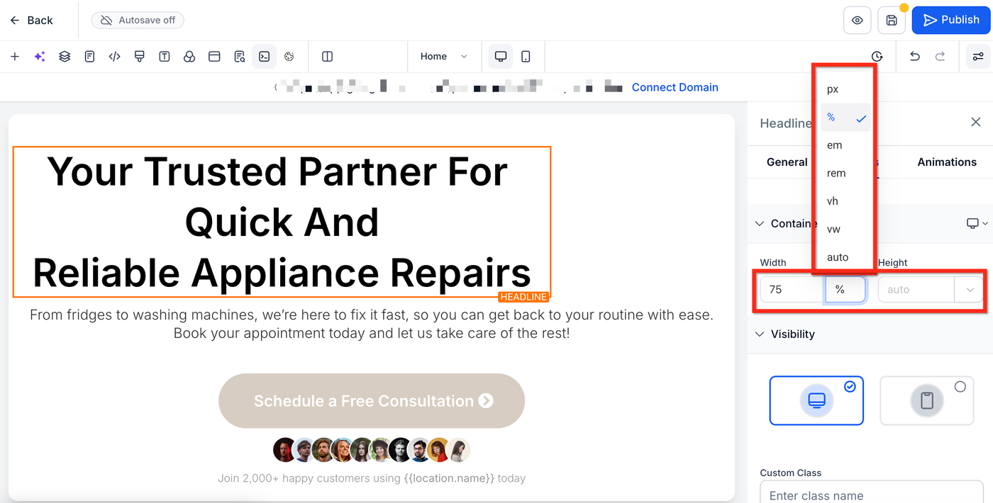 Container Size ist eine integrierte Steuerung im Page Builder, mit der Sie die Höhe und Breite eines Elements direkt im Builder festlegen können. Diese Werte bestimmen, wie viel Platz ein Element innerhalb seines übergeordneten Containers (z. B. Spalte, Reihe oder Abschnitt) einnimmt. Sie können die Einheit wählen, die am besten zu Ihren Layout-Zielen passt, und gerätespezifische Werte für responsive Designs festlegen.