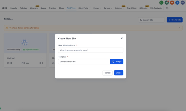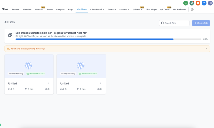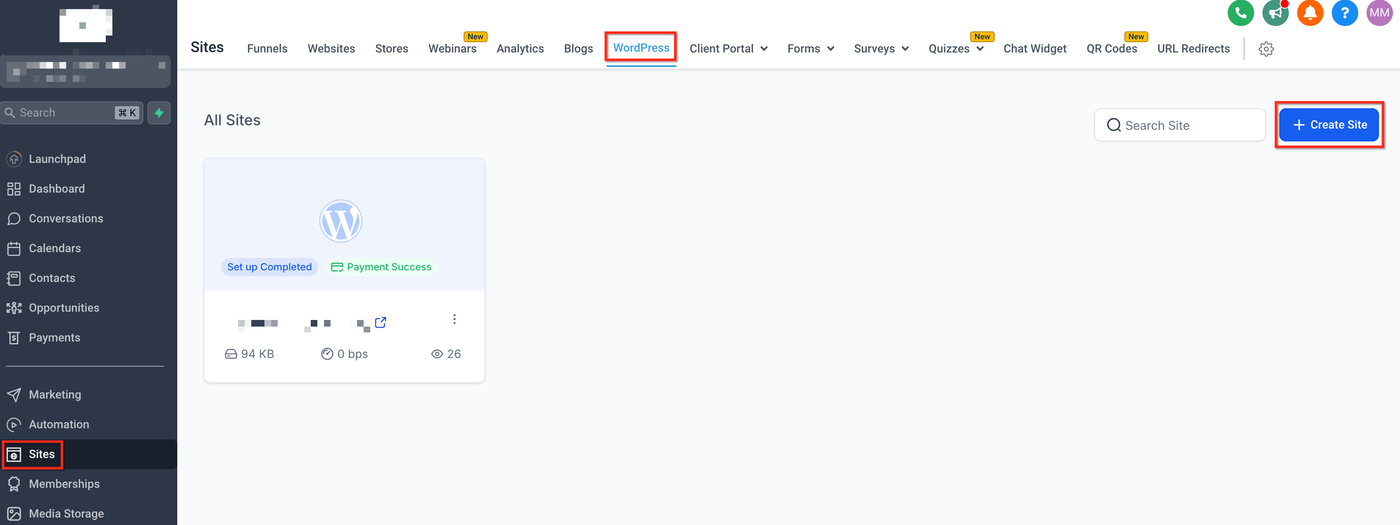 Navigiere zum Sub-Account > Sites > WordPress und wähle „+ Site erstellen“.