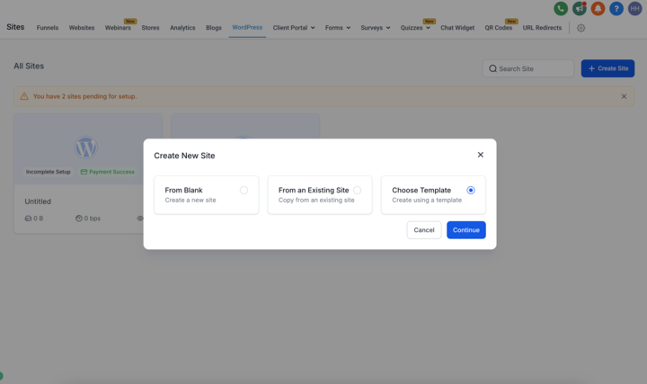WordPress Sites sind eine Alternative zu ProfitBoost Websites / Funnels. Anstatt den integrierten Site Builder und das Hosting von ProfitBoost zu verwenden, kannst du eine vollständige WordPress-Installation hosten. Dafür musst du den WordPress Hosting Plan von ProfitBoost abonnieren. Danach kannst du ihn wie jede andere gehostete WordPress Website verwenden.