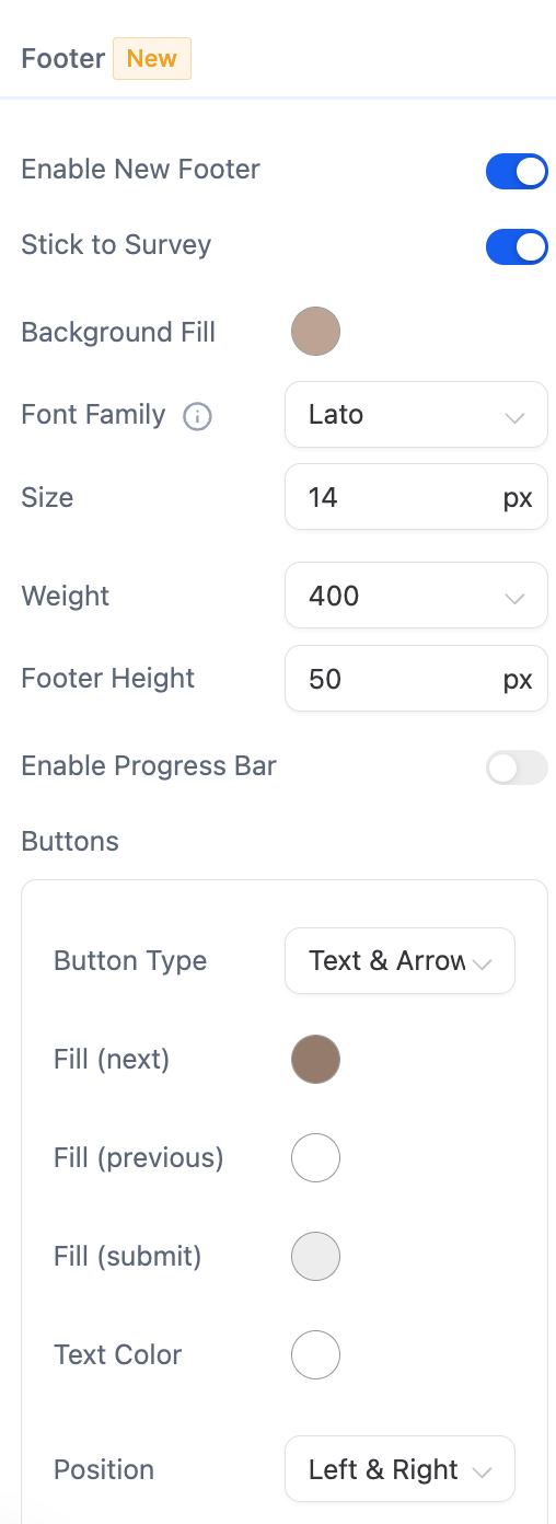 Hinweis: Bei neuen Umfragen sind die Anpassungsoptionen für den neuen Footer möglicherweise standardmäßig aktiviert. Bei bestehenden Umfragen bleibt der alte Footer zunächst aktiv, Sie können jedoch den neuen Footer optional einschalten, um das Design zu verbessern – abhängig von den Einstellungen Ihres Survey Builders.