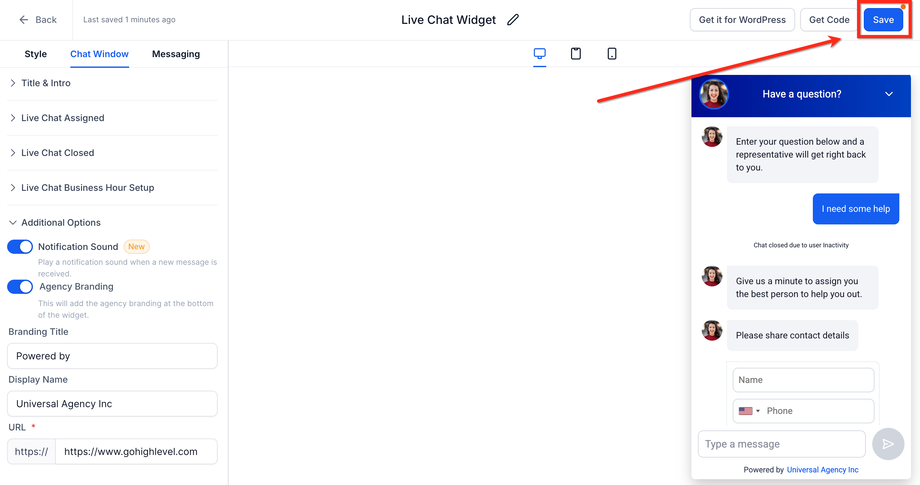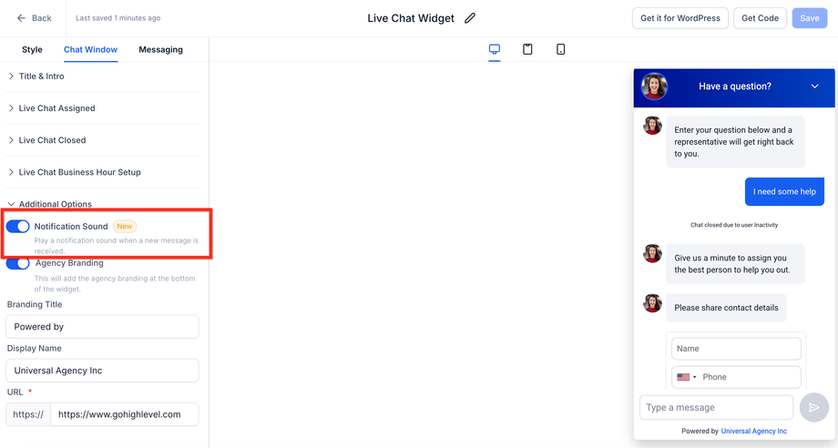 Du kannst „Notification Sound“ direkt im Chat Widget Builder für unterstützte Chat-Typen konfigurieren.