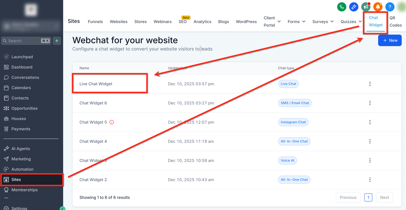 Gehe zu Sites → Chat Widgets und öffne das Widget, das du bearbeiten möchtest