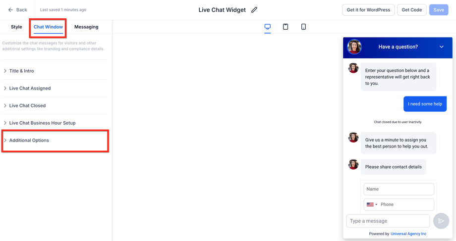 Wähle im linken Menü den Tab Chat Window