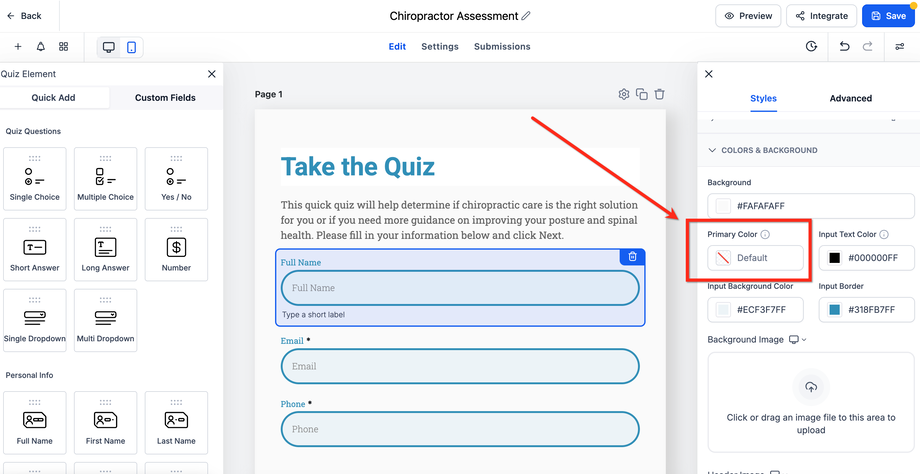Scrollen Sie zum Bereich Primary Color unter Farben & Hintergrund