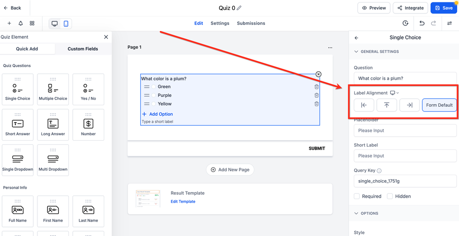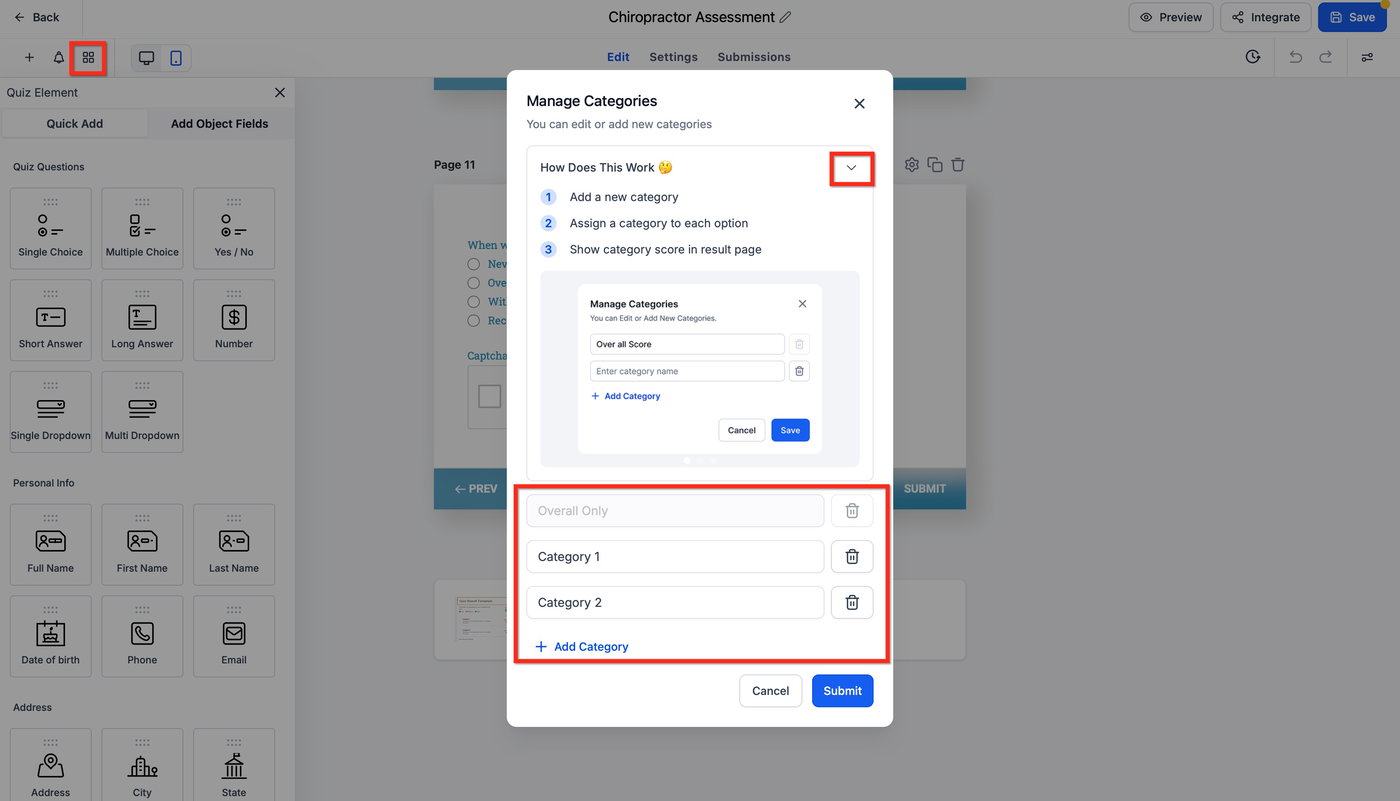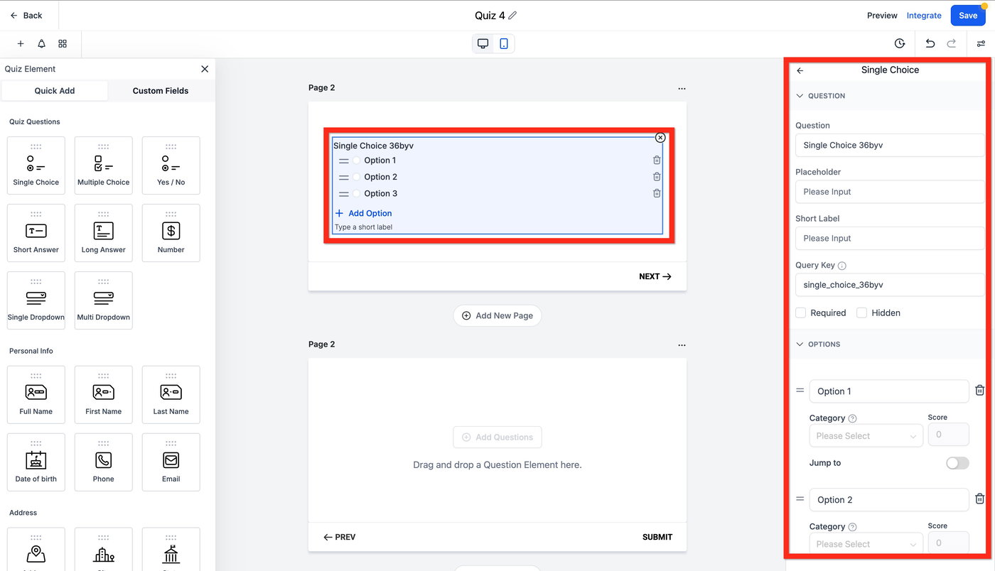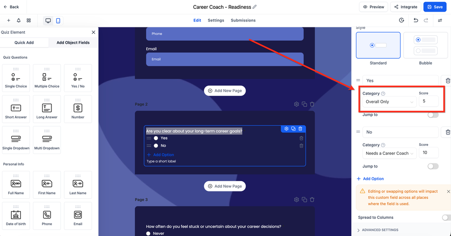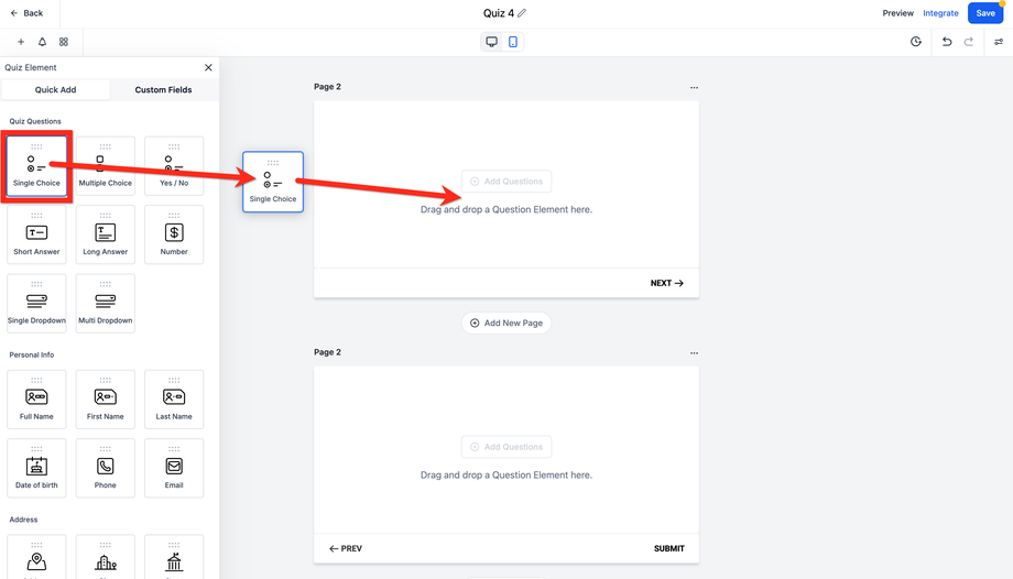 Es gibt viele vorgefertigte Quiz-Elemente per Drag-and-Drop. Zusätzlich kannst du jedes Contact- oder Opportunity-Custom-Field zum Quiz hinzufügen.