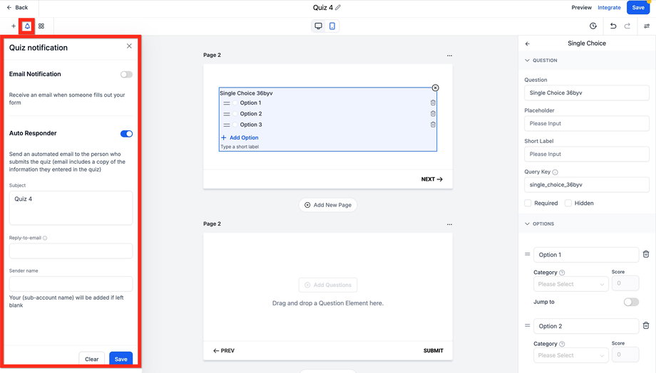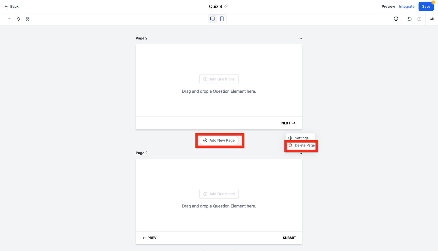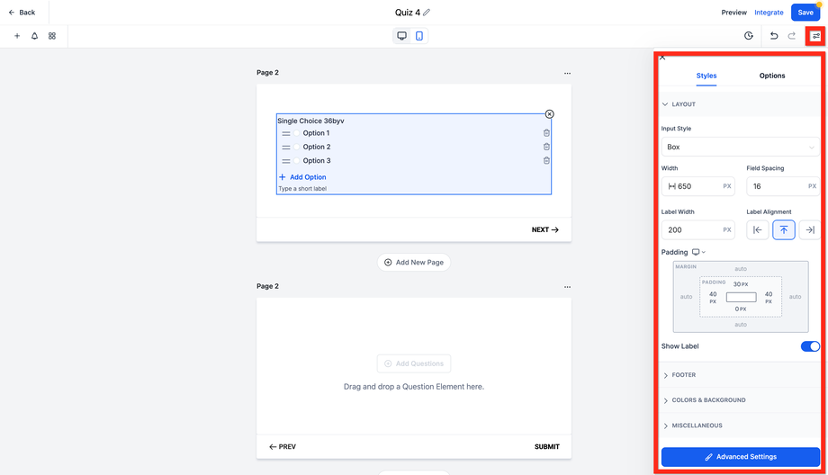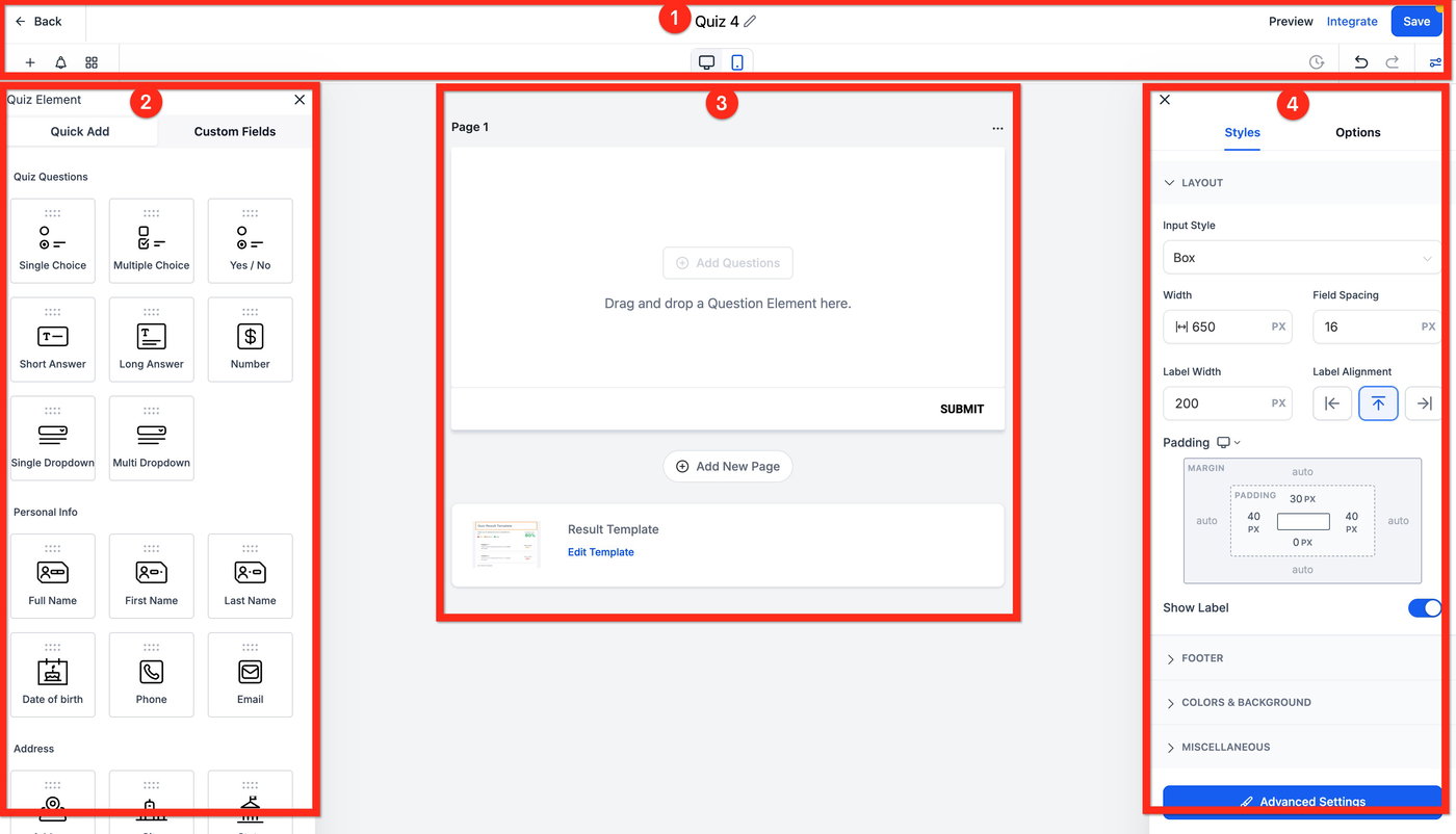 Top Panel: Hier findest du den Zurück-Button, den Titel des Quiz, den Vorschau-Button, den Integrate-Button, den Save-Button, den Umschalter für das linke Panel, den Wechsel zwischen Desktop- und Mobilansicht, die Versionsliste, Undo/Redo sowie den Umschalter für das rechte Panel.