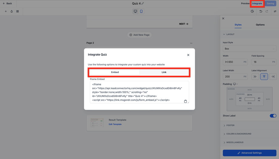Nachdem du dein Quiz gespeichert hast, klicke oben rechts auf Integrate.