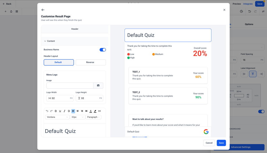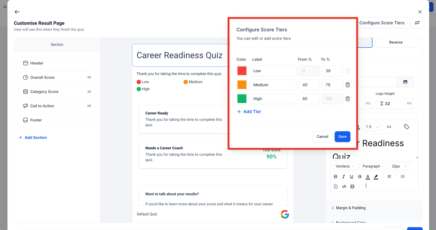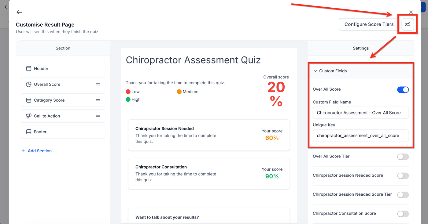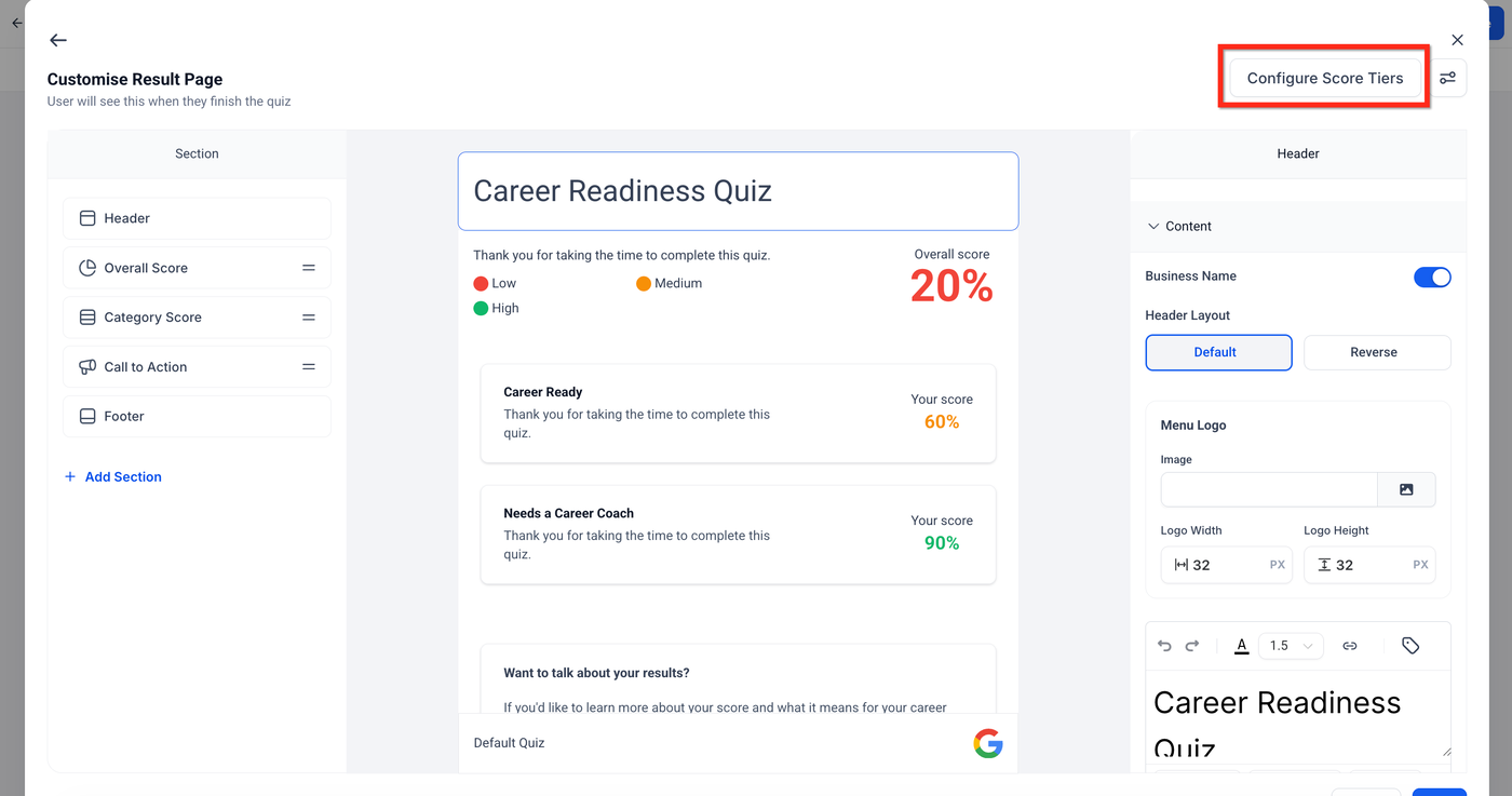 Personalisierte Erfahrung: Passe die Ergebnisseite mit Score-Stufen, Abschnitten und CTA an.