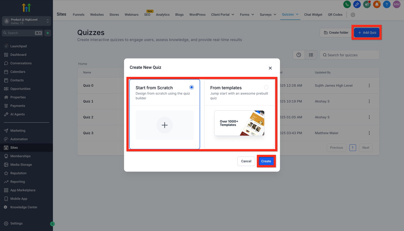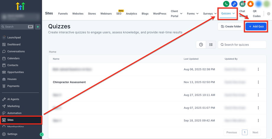 Navigiere zu Sites → Quizzes → + Add Quiz oder wähle ein bestehendes Quiz aus.