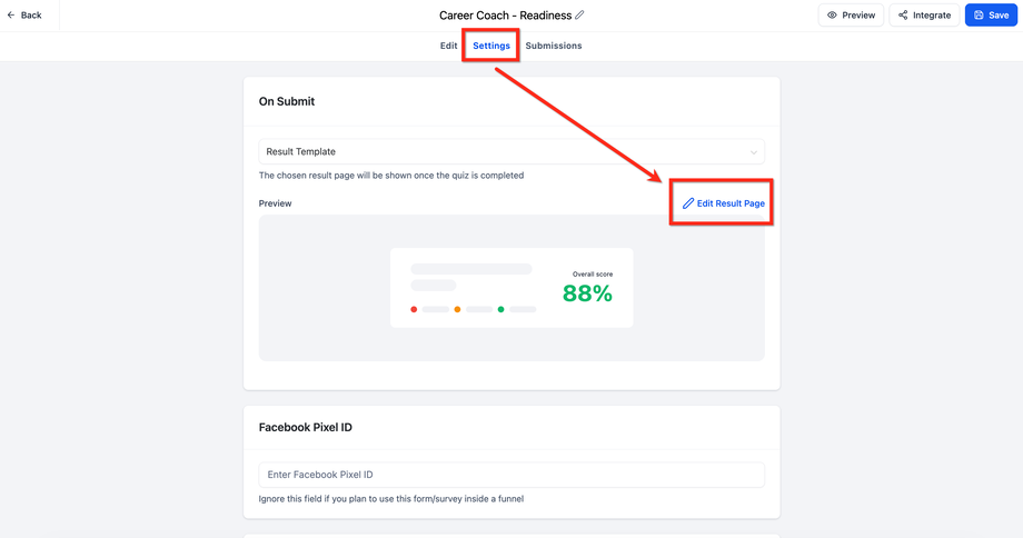 Gehe im Quiz-Editor zu Settings > Edit Results Page.
