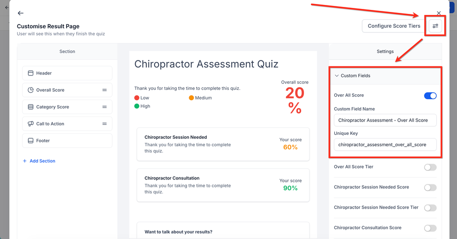 Quiz Result → CRM Field Mapping schreibt die Quiz-Ergebnisse eines Kontakts – wie Gesamtscore und Tier, Kategorie-Scores und Tiers sowie Details zu höchsten/niedrigsten Kategorien – in kontaktbezogene Custom Fields in ProfitBoost.