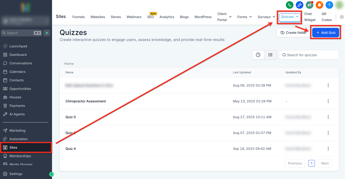 Wähle ein bestehendes Quiz aus oder klicke auf den blauen Button + Add Quiz, um ein neues Quiz zu erstellen.