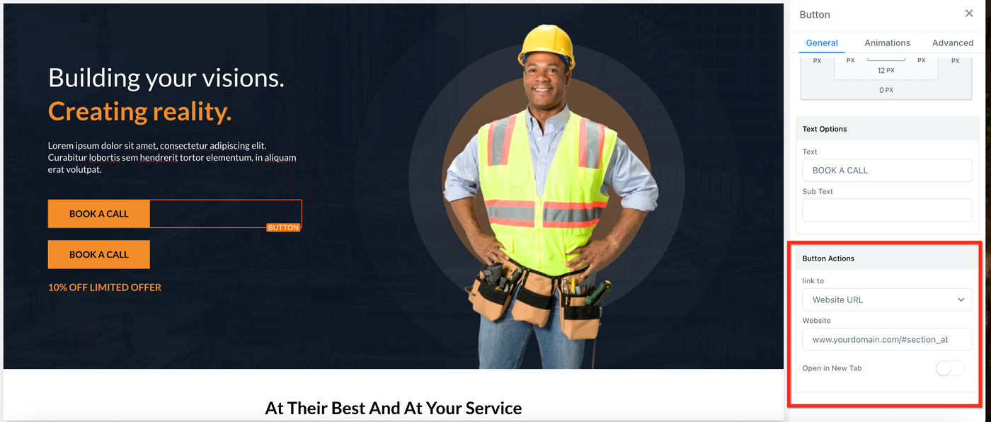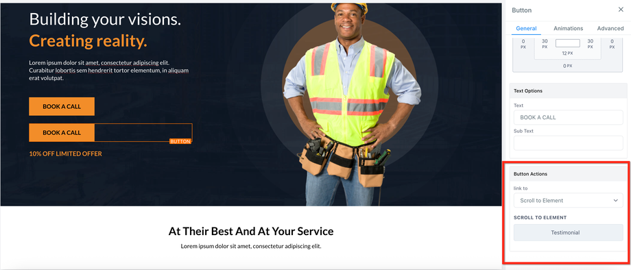 Unter Button Actions → Link To → Scroll to Element auswählen.