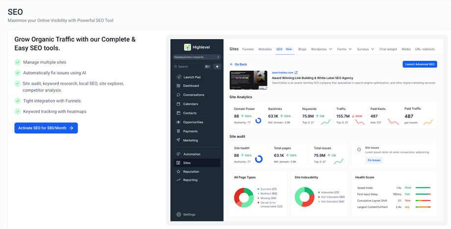 SEO ist eine integrierte Suchmaschinenoptimierungs-Lösung, die von Search Atlas betrieben wird. Dieses Tool ermöglicht es Unternehmen und Agenturen, Websites zu optimieren, ohne Drittanbieter-Tools zu benötigen. Es bietet leistungsstarke Funktionen für Keyword-Recherche, Website-Audits, Backlink-Analyse, Content-Optimierung und SEO-Reporting.