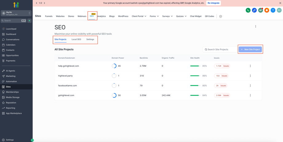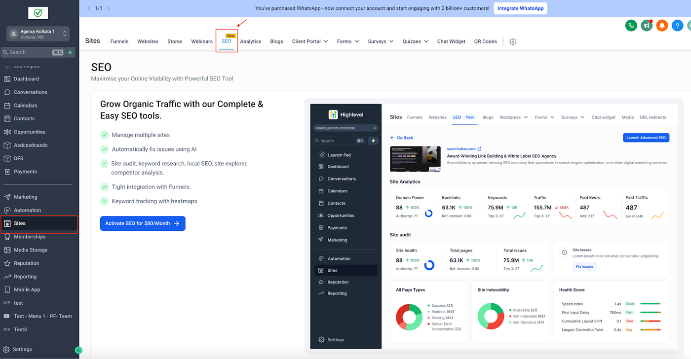 Zum Start logge dich in deinen Sub-Account ein und gehe zu Sites > SEO.