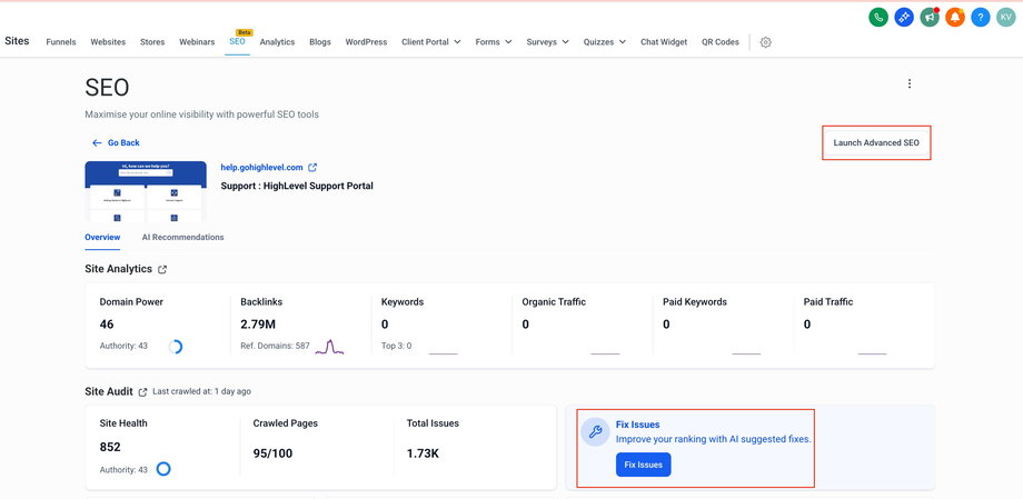 Im SEO-Dashboard gibt es den Button „Launch Advanced SEO“.