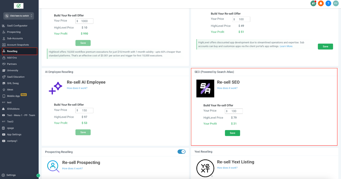 Die Plattform berechnet pro Sub-Account mit aktiver SEO-Nutzung