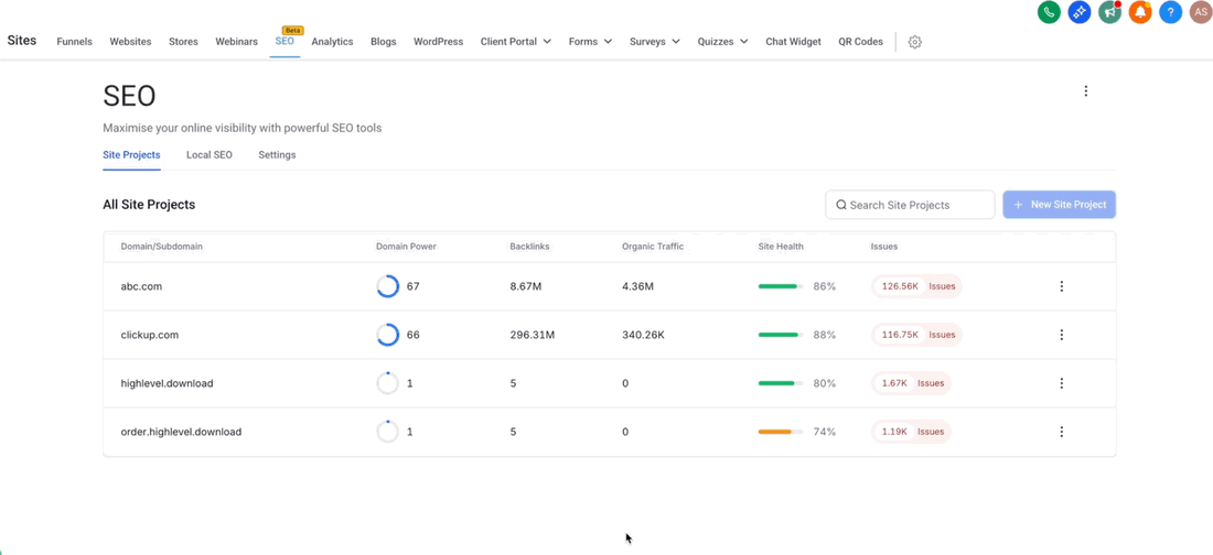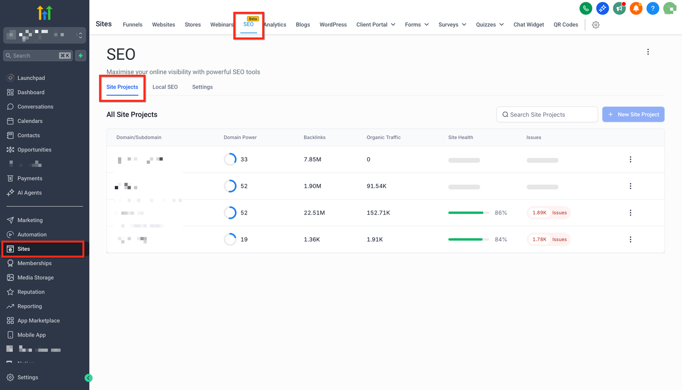Gehe in deinem Sub-Account zu Sites → SEO → Site-Projekte und wähle das gewünschte Site-Projekt aus.