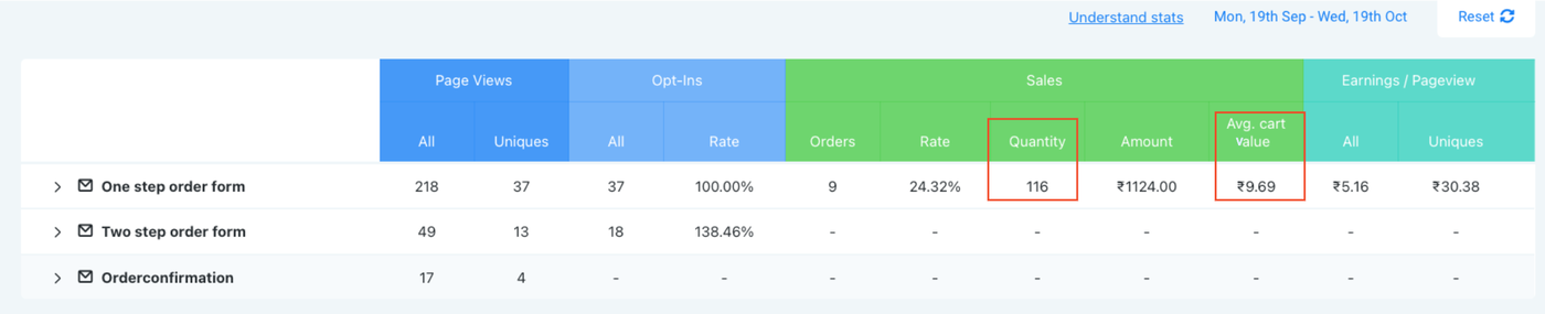 Durchschnittlicher Warenkorbwert und Menge in den Funnel-Statistiken