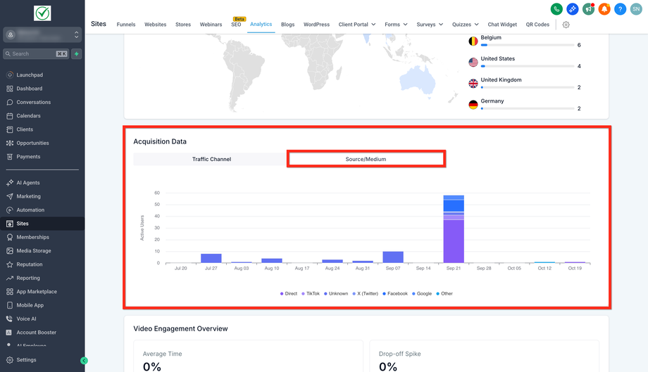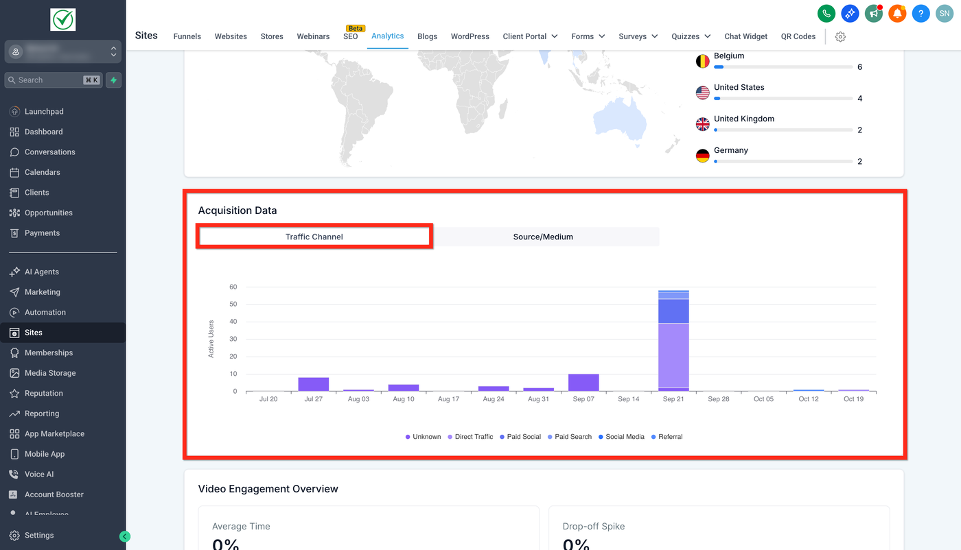 Traffic Source Analytics ist ein visuelles Dashboard in Sites → Analytics, das den täglichen Traffic nach Marketingkanälen und Quellen aufschlüsselt. Das gestapelte Balkendiagramm und die begleitenden Tabs (Traffic Channel und Source/Medium) ermöglichen es Ihnen, Ergebnisse den richtigen Kampagnen zuzuordnen, Kanäle über die Zeit zu vergleichen und das gesamte Dashboard bei Bedarf auf ein bestimmtes Datum zu filtern.