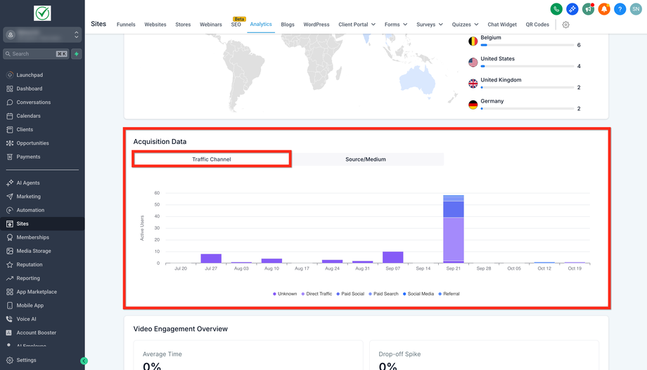 Scrollen Sie zu Acquisition Data und wählen Sie den Tab Traffic Channel für eine Kanal-Übersicht (z. B. Direct Traffic, Paid Social, Paid Search, Social Media, Referral).