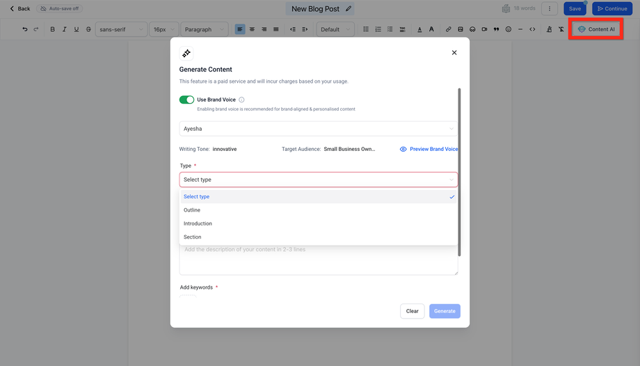 Content AI klicken → konfigurieren → KI-generierten Text als Ausgangspunkt nutzen.
