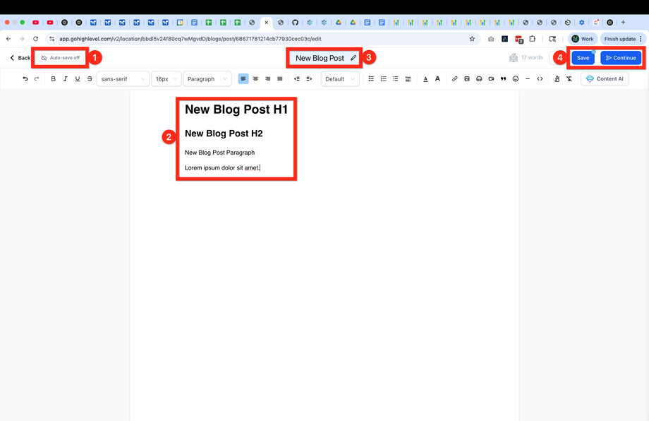 Save and Continue: Speichern Sie manuell und klicken Sie auf Continue, wenn Sie fertig sind.