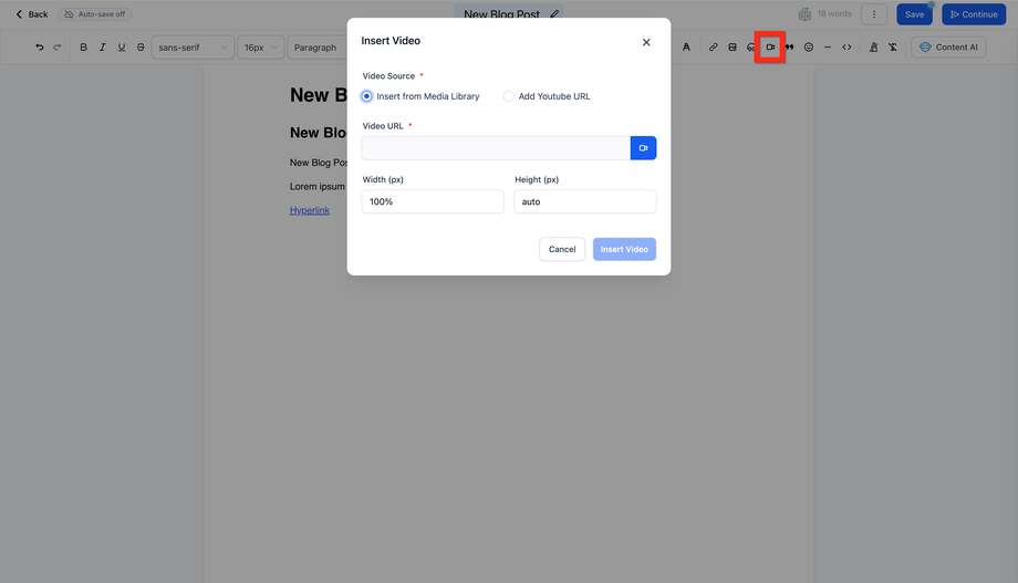 Video: Kamera-Symbol → Datei aus Media Library oder YouTube → Insert Video.