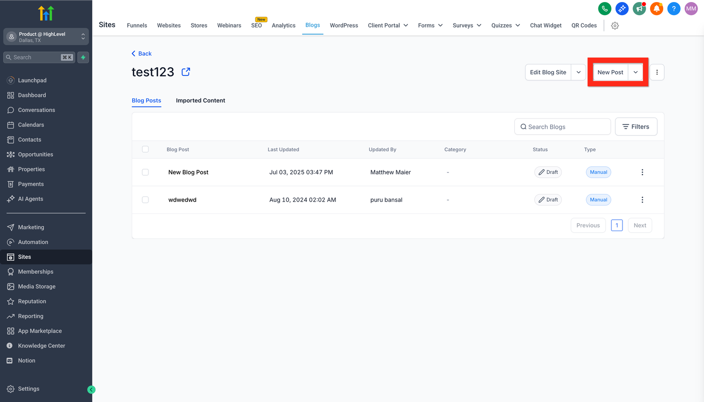 Klicken Sie auf New Post in der Liste des ausgewählten Blogs.