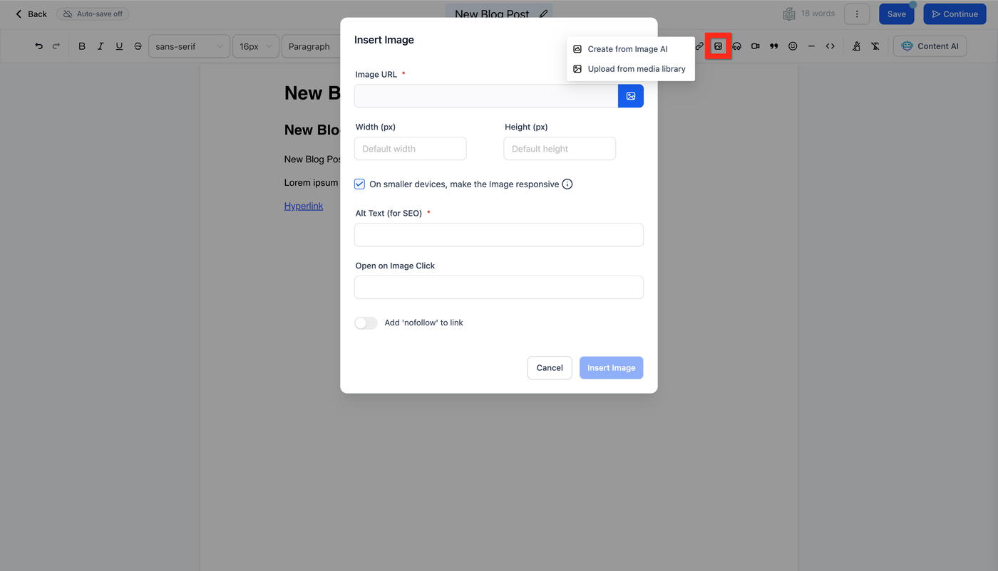 Bilder: Bild-Symbol klicken → URL, Media Library oder Image AI wählen → Insert Image.