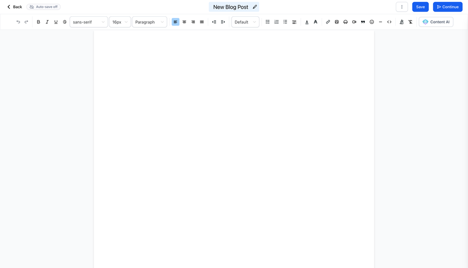 Ein Blogpost ist ein einzelner Artikel, der in Ihrem Blog veröffentlicht wird. Er ist SEO‑bereit, unterstützt Multimedia (Bilder, Videos, Audio) und kann mit Content AI erstellt werden.